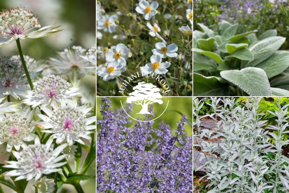 Oluline – valged õied on siin pilgupüüdjateks, mitte tooniandjateks. Istutuse „kandev“ roll neis kombinatsioonides on hallil ja salveirohelisel lehestikul, mis toob valge elegantselt esile.