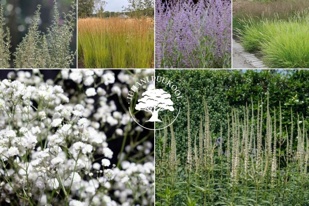 1 Kobar-õisenelas 'Niagara'│2 Jõhvik-lodjapuu 'Dart's Graduate'│3 Pööris-kipslill 'Festival White Flare'