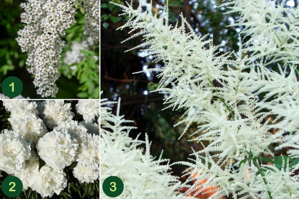 - Valged toonid: Arendsi astilbe 'Weisse Gloria', liht-lursslill ‘White Pearl’